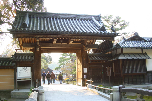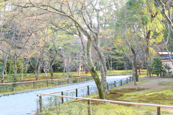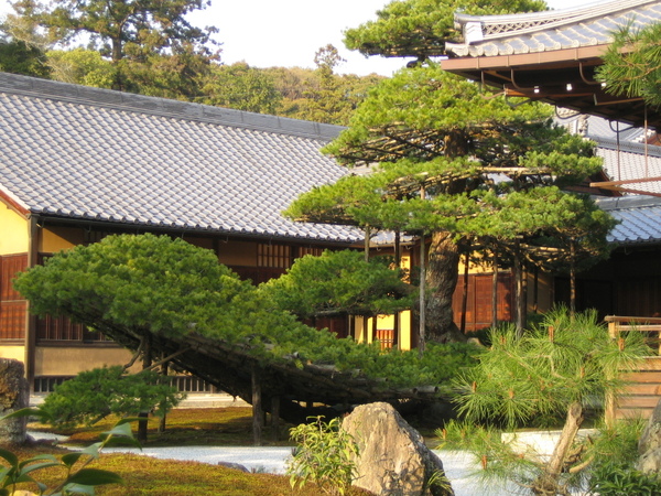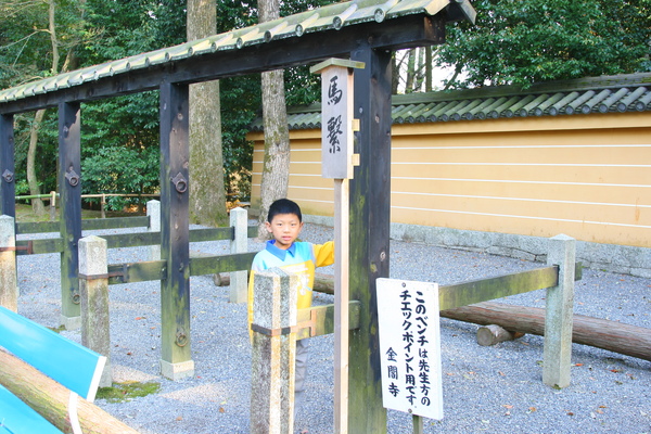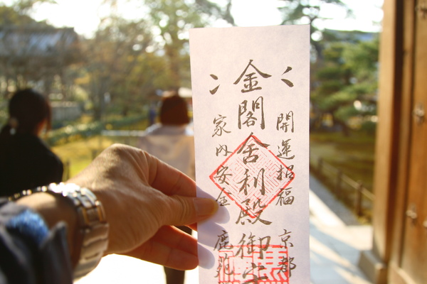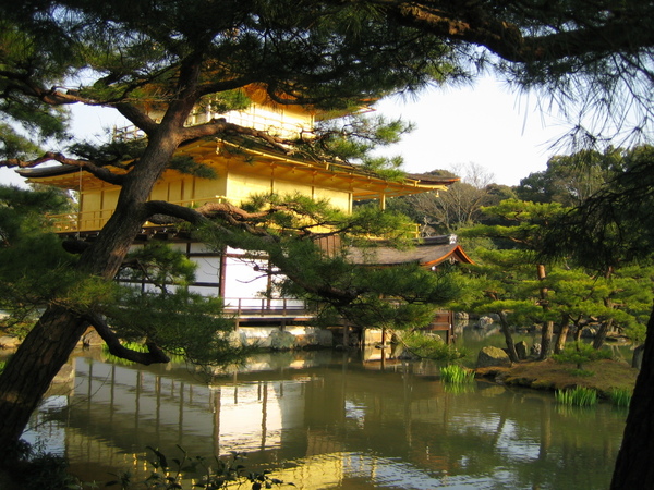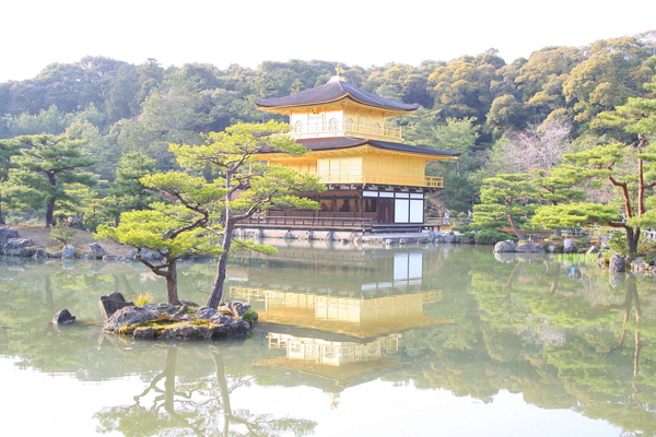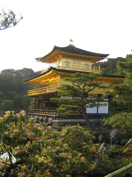 金閣寺初名鹿苑寺。由於外表貼金,故又稱金閣寺。聳立在鏡湖池水之中,呈四方形。原為幕府將軍足利義滿的別墅,為顯示幕府武士政權的一統天下的至上權力,金閣寺舍利殿的一至三層的樓閣分別以幕府政權建築,皇家宮廷建築和佛教建築格式修建,最頂層的塔頂裝飾有一具金銅合金的鳳凰,遠遠望去,金光燦燦,絢麗奪目。