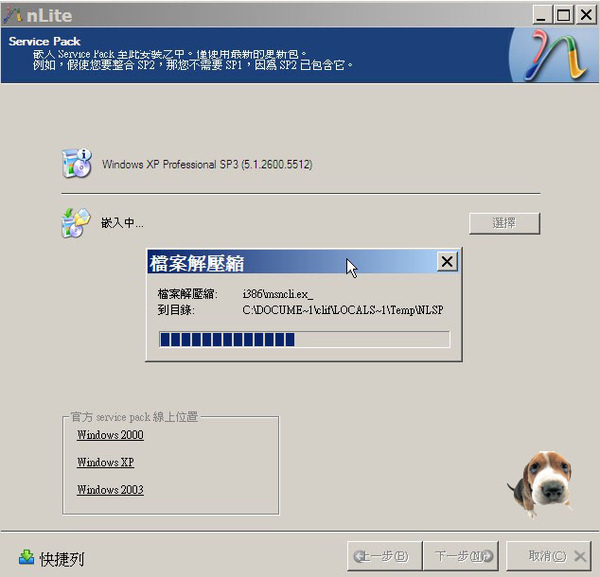 這裡去微軟網站下載xp SP3,單一檔案下載回來就好,不需要解壓縮,此處選擇後他會自動解壓縮。