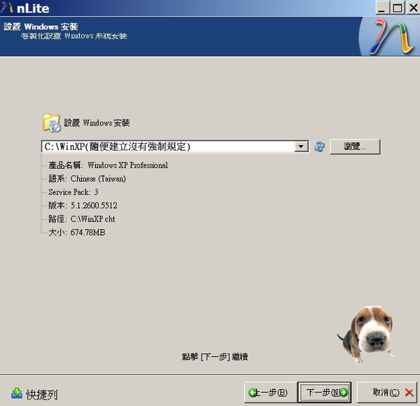 然後按瀏覽選擇剛剛建立一個WinXP資料夾按下一步
