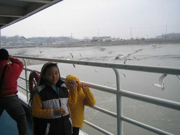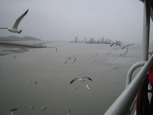 難得的經驗海鷗會搶食手上的蝦味先,我們搭船這船不是小船連遊覽車都上的了,終於知道為什麼買了一包超大的蝦味先,人手一把捉的就是要餵食海鷗,真是難得的經驗海鷗這海面上飛行後,不管你是拿在手上或是拋到空中,那些傢伙就是有辦法吃到,奇怪牠們是怎麼辦到的。