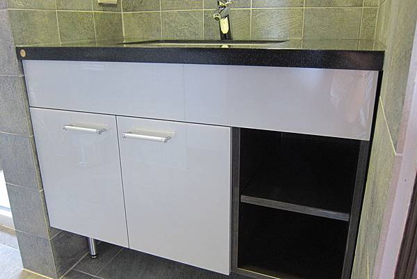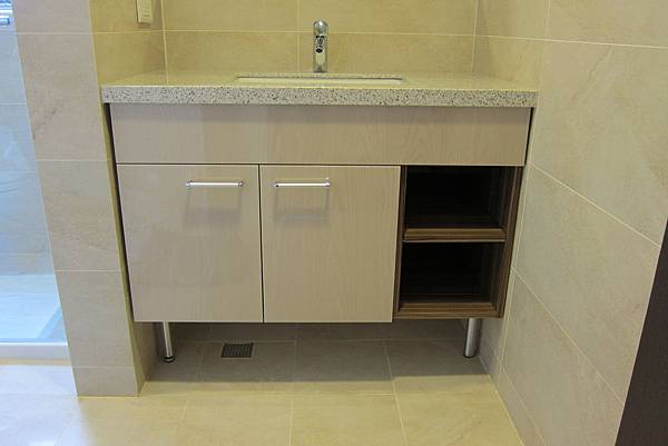 KOHLER下嵌盆及水龍頭,在這ㄇ型的空間內是絕佳的設計,寬大的檯面提供置放空間,開放式收納可以放置隨手的物品。