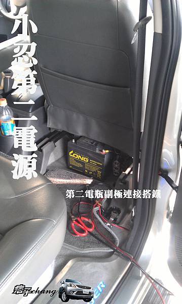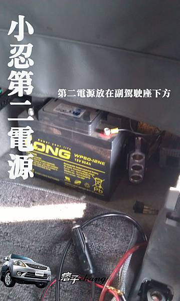 第二電瓶是隱藏在副駕駛座的下方,我是早想好放的位置才去找電池的大小,免加水免保養又不會因充電產生毒氣考量,另外接12V的電源分接器3孔。